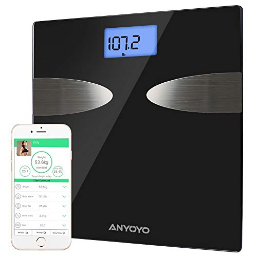 ANYOYO Schermo LCD del Bluetooth Bilancia Corporea?Smart APP Può riconoscere automaticamente su Peso corporeo, grasso, ossa, acqua, muscolare, BMI, BMR, percentuale grassi e 10 profili utente.